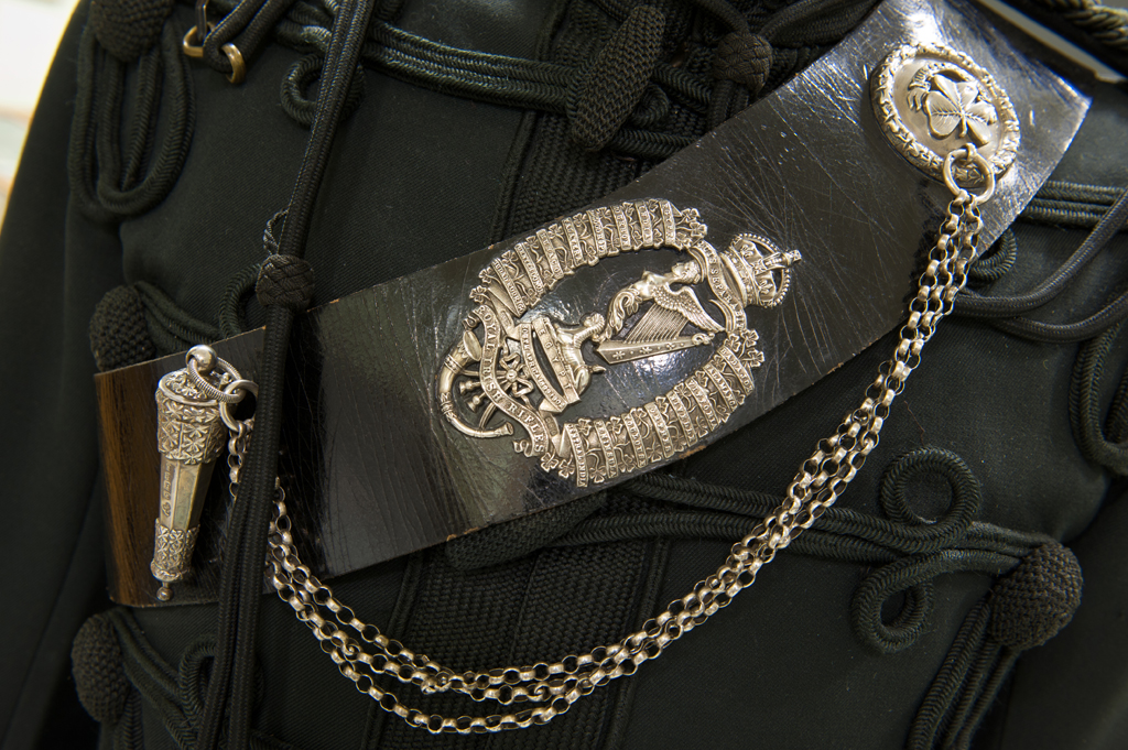 The cross belt with rear pouch and whistle was retained by The Royal Irish Rangers, albeit in brown leather with a Ranger badge on the front, and is now a part of The Royal Irish Regiment officers' uniform (left), thereby maintaining another link with our antecedent and founding regiments. The rear pouch carries an eagle and its origins date back to the Battle of Barrosa.