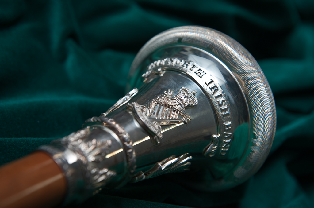 A Mace carried by the Drum Major of the North Irish Band, the band which supported the Territorial Battalions of the North Irish Brigade and The Royal Irish Rangers. The Cap Badge fixed on the Mace is that of The Royal Irish Rangers.
