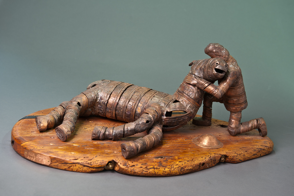 The work of Rik Ryon, from Proven in Flanders, has its roots in a long tradition of trench art. One of the soldiers' favourite pastimes, in or out of the trenches, was to salvage pieces of brass and copper from the used artillery shells to make ornaments to sell or send home to their families. Using the copper driving bands recovered from First World War shells and the debris of First World War dug outs, Rik Ryon carries on these skills and techniques in his sculptures. His figures reflect the artist's deep respect and empathy for the daily life of the soldier. His sculptures hold a remarkable place within contemporary art about war and peace. With the First World War as a central theme, his sculptures are not abstract, but realistic and profoundly human. They provoke and enable the viewer to think about the horrors of war and use their imagination to envisage the personal tragedies that war creates.