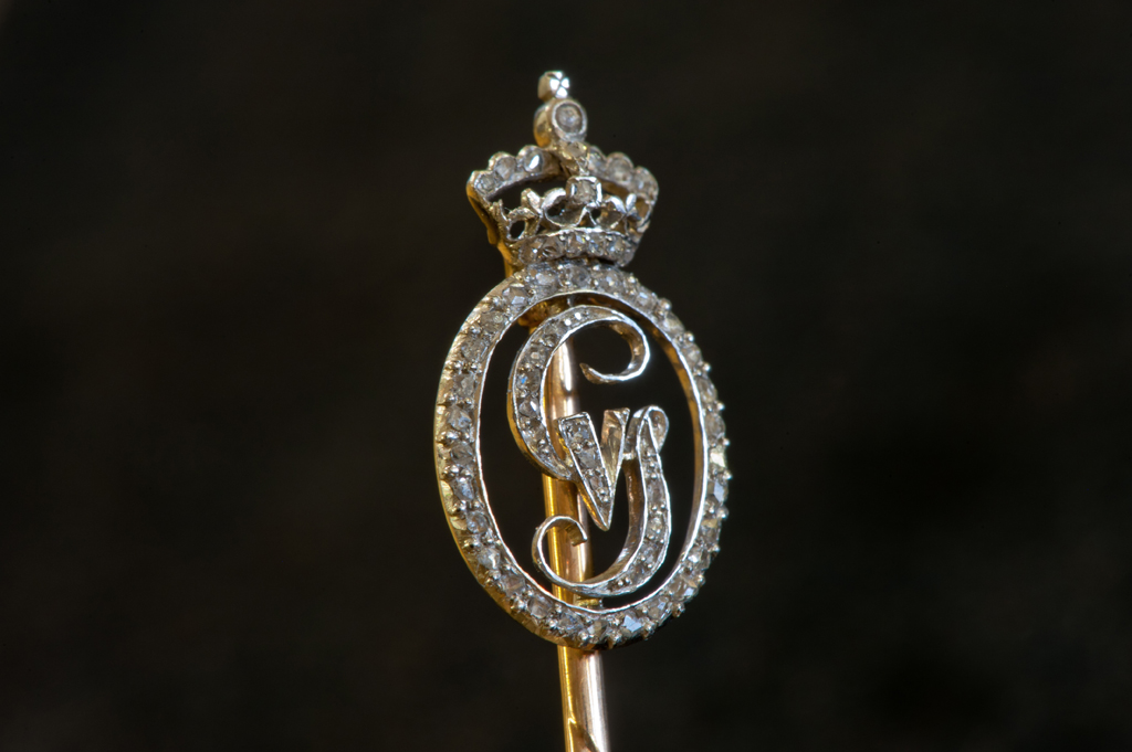 In 1911, shortly after his coronation, King George V and Queen Mary were on an official tour of India. Major Henry Ball Holmes was then an officer in the 2nd Battalion of the Royal Irish Fusiliers appointed to serve as an equerry on the Royal Train and at the Delhi Durbar. The Delhi Durbar was a mass gathering held to mark the coronation of a British King or Queen during the time of empire. In appreciation of this service the King presented him with this diamond encrusted monogrammed stick pin.