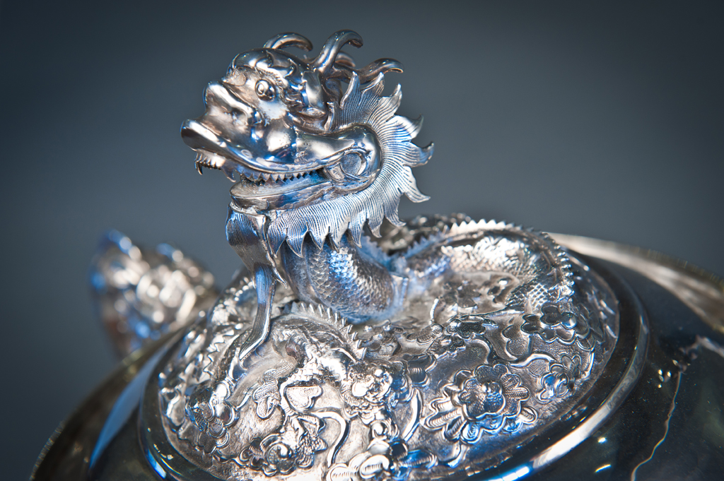 Detail from the lid of a large silver cup 'presented to 1st Inniskillings by the European residents in Tientsin, China for their good service during the disturbances 1909 – 1912'.