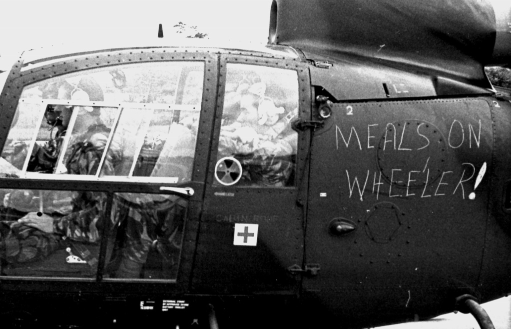 One of these patrols found Guatemalan military engineers building a road just inside the border with Belize. A permanent presence was then established there by one platoon from 2 R IRISH to prevent this incursion by the Guatemalans going any deeper into Belize, which became known as Treetops OP. Gradually, the Platoon and the Guatemalans became friendly in the isolated jungle clearing, playing volleyball with the net placed along the border between the two countries! The Guatemalans were particularly impressed with the logistic support provided to the 2 R IRISH platoon, especially the ice cream in this hot, humid temperature that was flown in by RAF Puma helicopter, together with the other supplies of food, water and mail. Eventually, the Guatemalans invited the Platoon back to their camp inside Guatemala for a barbeque and beers – a good time was had by all!