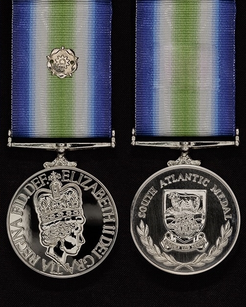 Below: The South Atlantic Medal was awarded for service in the Falklands Islands, the dependencies, or in the South Atlantic between 2 April 1982 and 14 June 1982. The rosette is also awarded to those with service in the Falkland Islands or their dependencies, or in the South Atlantic, south of 35° south and north of 60° south before 14 June 1982.