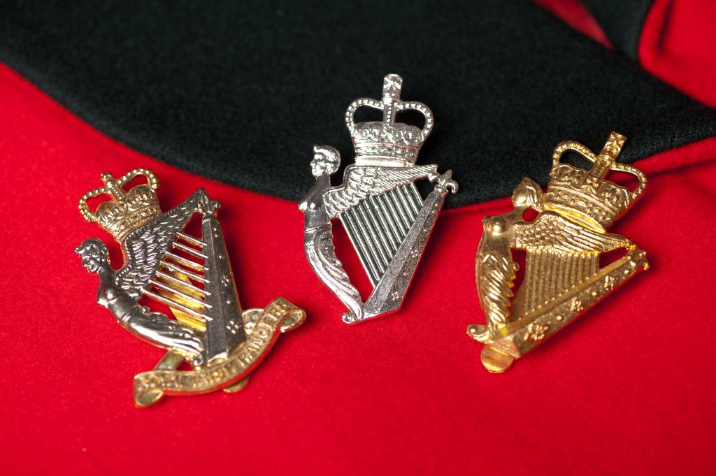 | The new Royal Irish Regiment cap badge (centre) with Rangers (left) and UDR (right). |