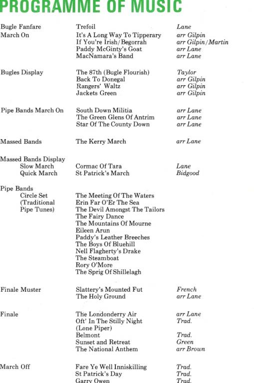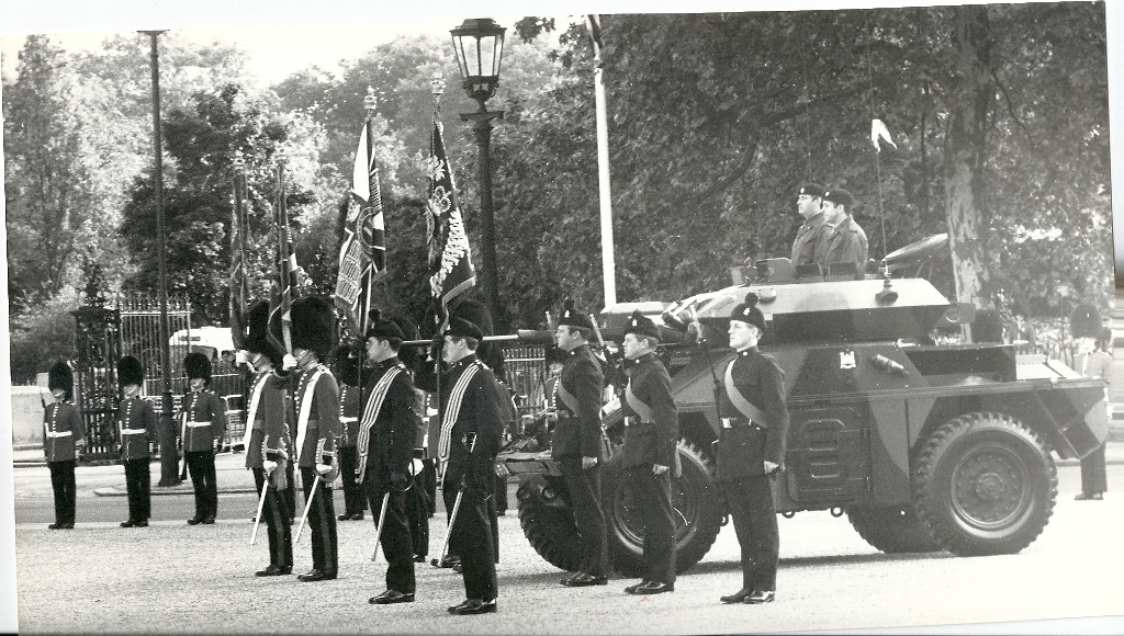 On 8 June 1981, the Bands, Bugles, Pipes and Drums of the Irish Regiments Beat Retreat on Horse Guards Parade in the presence of Her Majesty Queen Elizabeth The Queen Mother. Representatives of all the Irish regiments that remained in the British Army were assembled to take part in the traditional ceremony of Beating Retreat. The Guidons and Colours on parade commemorated past battles and glories. The 370 Battle Honours represented were evidence of the indomitable spirit of the Irish Soldier.