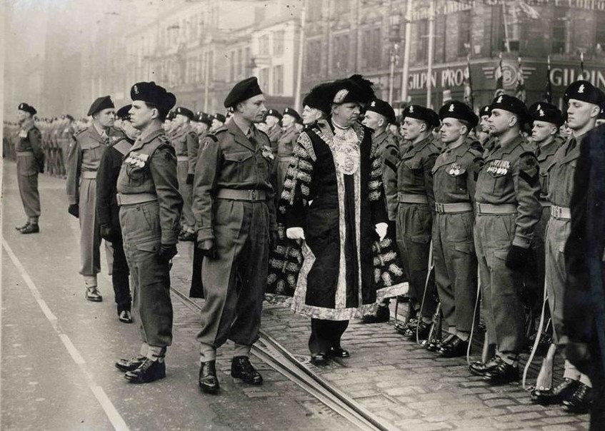 Over 20,000 gathered at the front of the City Hall, Belfast to watch the The Royal Ulster Rifles receiving the Freedom of Belfast, the first regiment to do so. The Lord Mayor, Sir Percival Brown, inspected the parade and then presented the Colonel of the Regiment, General Sir James Steele, with a silver casket containing the Certificate of Freedom. General Sir James Steele then signed the Register of Freedom. The Lord Mayor took the salute as the Regiment marched past.