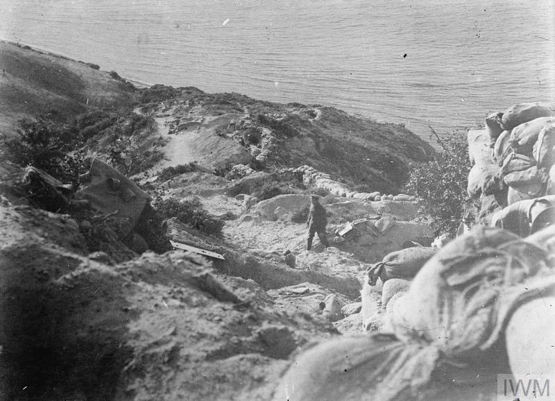 Fusilier Bluff Trenches, going down to the sea. Front line trenches on the left. Turkish Line was on the other side of the gully on the right. (So-called after Royal Inniskilling Fusiliers, who retook it on 2 July 1915).