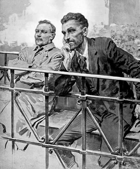 | Daniel Bailey, on the left, and Sir Roger Casement in the dock of Bow Street Police Court on 15 May 1916 before being committed for trial at the Old Bailey on charges of High Treason |