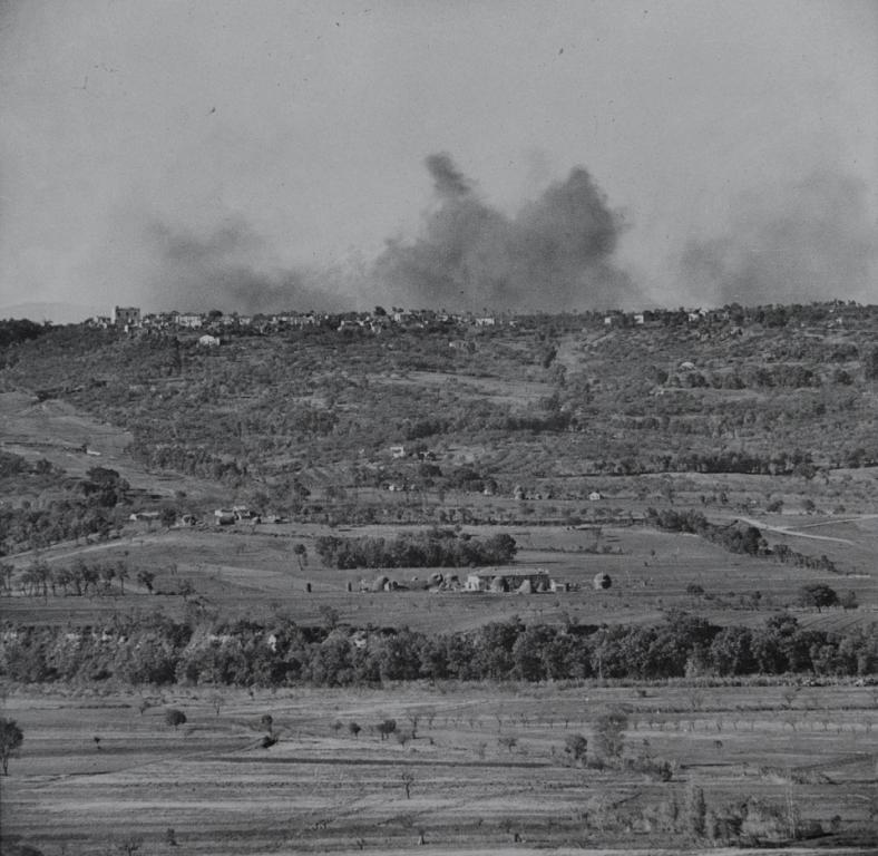 | Bombs from British medium bombers fall on the town of Fossegesia during the Allied approach to the river. |