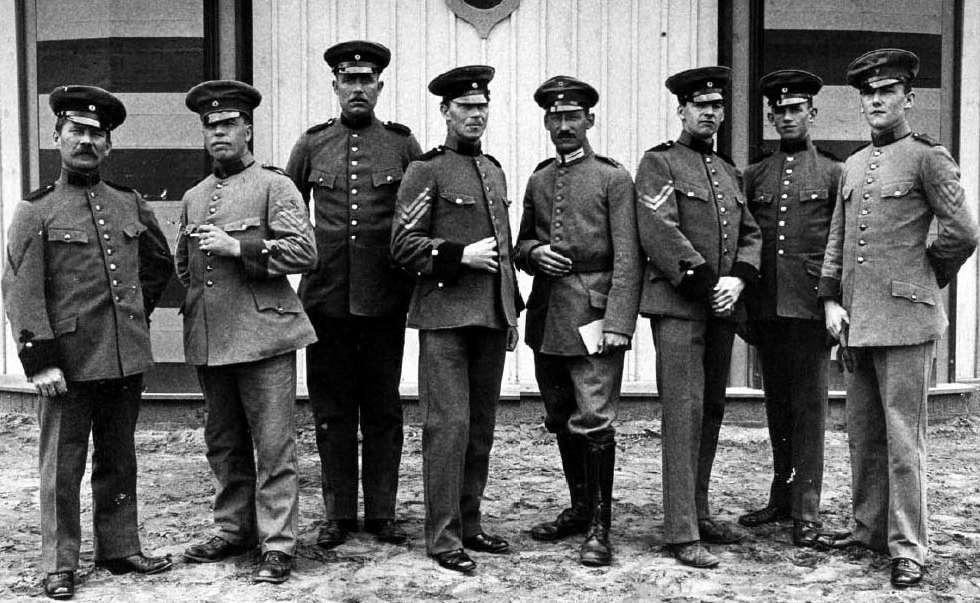 | Bailey is fourth from the left and on his left, wearing knee-length boots, is the German interpreter, Zerhussen. The remainder are POW members of Casement's 'Irish Brigade'. |