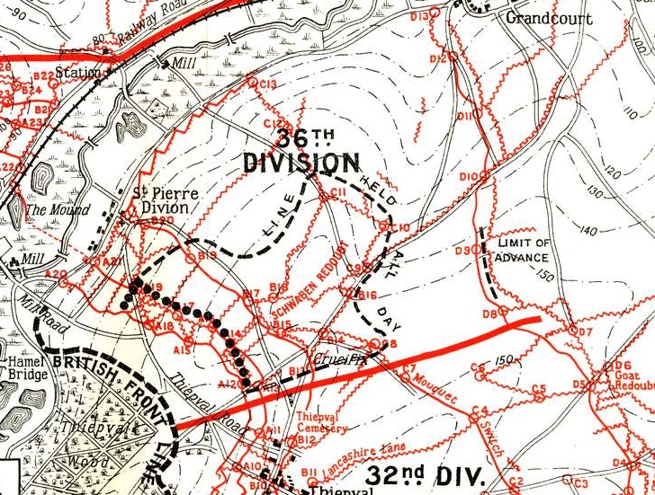 | Map of 36th (Ulster) Division's objectives, 1 July 1916. |