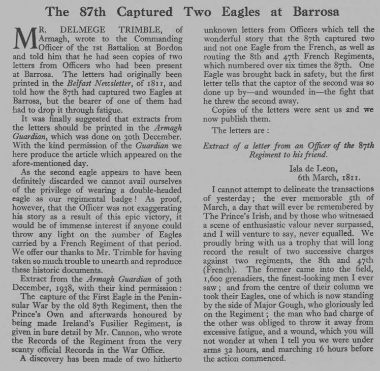 The story of the capture of the Eagle of the French 8th Line Infantry Regiment at the Battle of Barrosa can be read elsewhere on this site. The letters shown here suggest that the 2nd Battalion of the 87th Regiment of Foot may have captured a second French Eagle at the Battle of Barrosa.