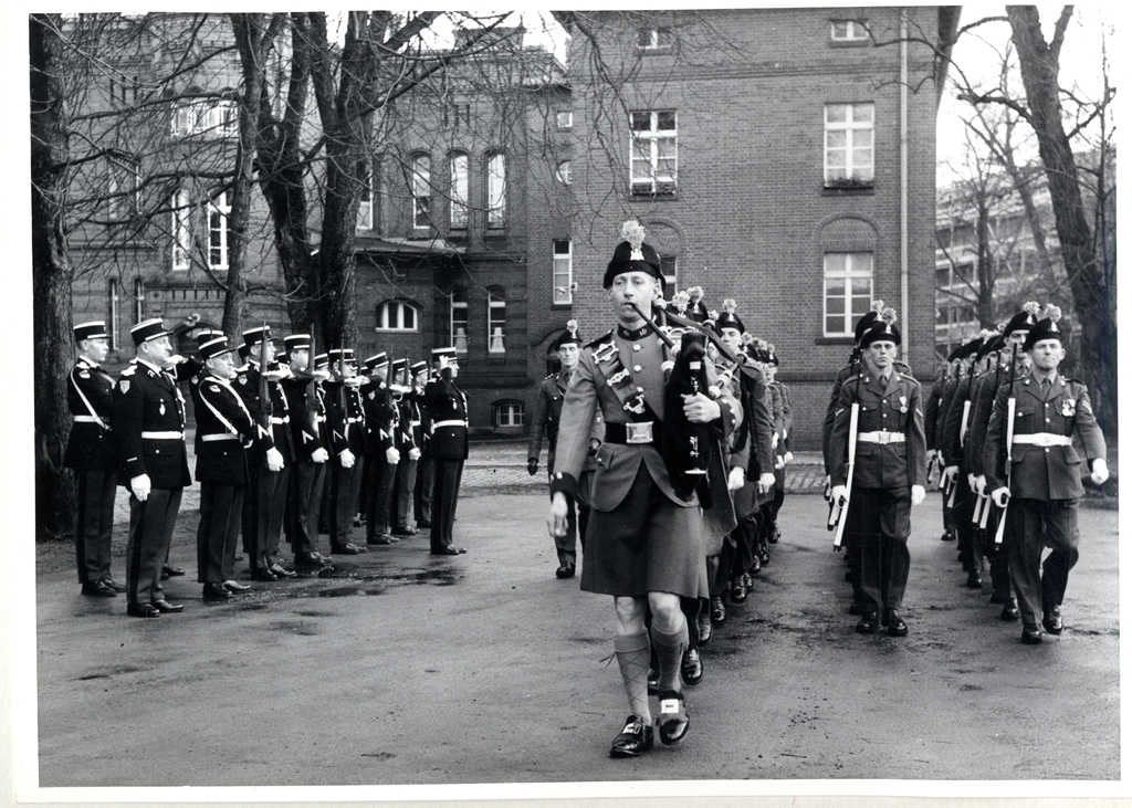 Life in Berlin was dominated by liaison and training exercises with the Americans and French and by limited contact with the Russians. In 1966, there was great excitement when a top-secret Russian MIG fighter crashed into the Havel Lake. The pilot was killed and his body returned to the Russians with great ceremony by an Inniskilling Guard of Honour.